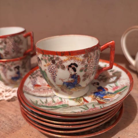 Japansk kutami serviset. Løvetann porselen. Har 10 tallerkener, 10 kopper, 7 skåler til koppen og en liten skål med hank.
