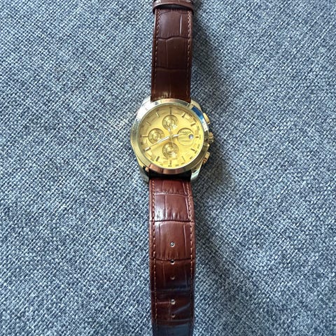 Inex dameklokke med rundt urkasse i metall og brun lærrem. Klokken har mørk urskive med markeringer og flere delskiver, samt trykknapper på siden av kassen. Passer som hverdags- og penklokke for dame.