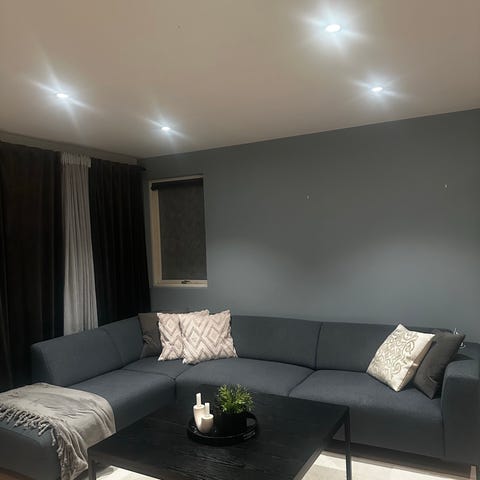 Venstrevendt sjeselong sofa - sett forfra. Ufattelig god og myk sofa. God kvalitet - nupper ikke. Brede puter. Føtter i lys eik. Fargen på sofaen er lyse grå. Kostet 17.000,- i 2021.