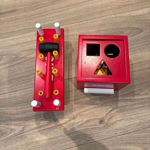 BRIO putteboks treleke. Klassisk sorteringsboks i tre med ulike fargede klosser i forskjellige former. Barn kan øve på finmotorikk, hånd–øye-koordinasjon og form- og fargelæring ved å plassere klossene i riktig åpning i boksen.