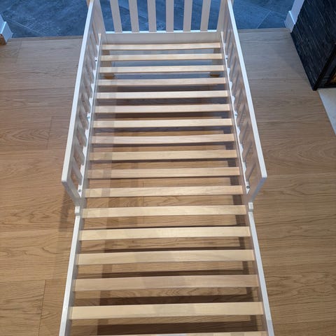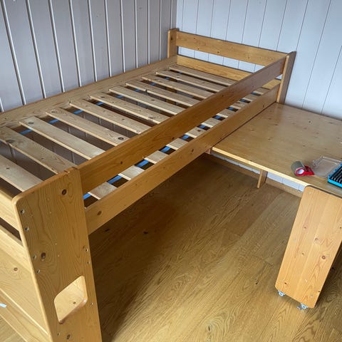 IKEA juniorseng i tre. Sengen har sengebunn med lameller i tre og sidekant med sprosser på begge sider ved hodeenden. Passer til barn som har vokst ut av sprinkelseng og over i juniorseng. Nøytral utforming som passer inn i de fleste barnerom. Madrass følger ikke med.