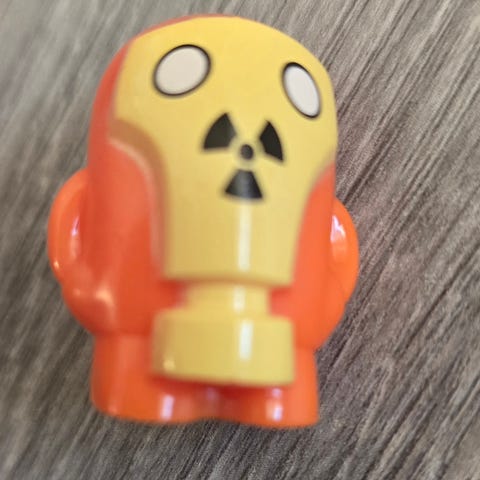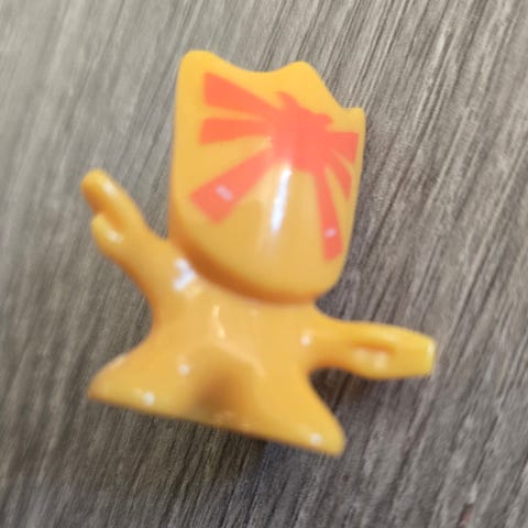 Design: Figuren har en gulaktig eller sennepsfarget kropp med en svart ansiktsmaske som viser et hvitaktig hodeskalle-lignende symbol.