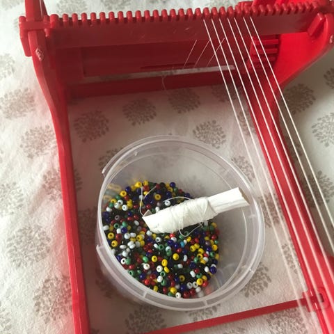 Fint brukt/lite brukt perle -vev.Den er tredd med sytråd men bør tres med tykkere tråd.Følger med rosa tråd og en egnet nål som passer til perlene .3 poser med perler,2 poser er ikke åpnet,de fulgte med veven da den var helt ny og en ekstra pose med perler.