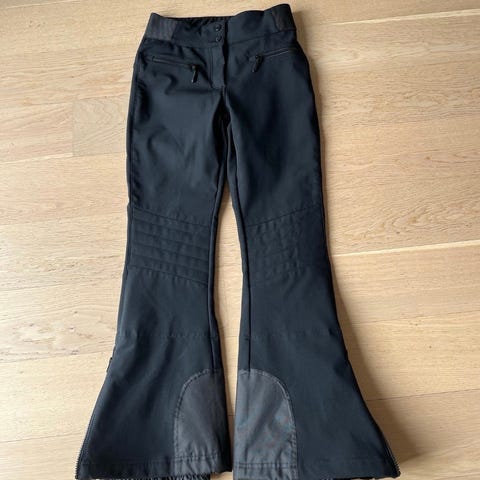 Buksene er svarte og har utsvingte ben med vatterte/kviltede partier foran på lårene. Innsiden ser ut til å være myk og lett fôret, og nederst på bena er det elastisk kant med antiskli, som kan passe til bruk over sko eller støvler. Egnet som overtrekks eller til utendørs bruk i kjøligere vær.
