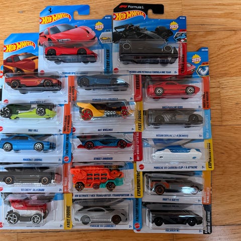 Hot Wheels lekebiler sett 10-pakning. Settet inneholder 10 små metallbiler i ulike farger og design. Bilene har plastdetaljer og roterende hjul, og passer til lek på gulv eller sammen med Hot Wheels-baner og -tilbehør. Størrelsen på bilene er typisk for Hot Wheels-modeller (ca. 1:64-skala). Egnet som lekebiler for barn eller som samlerobjekter.