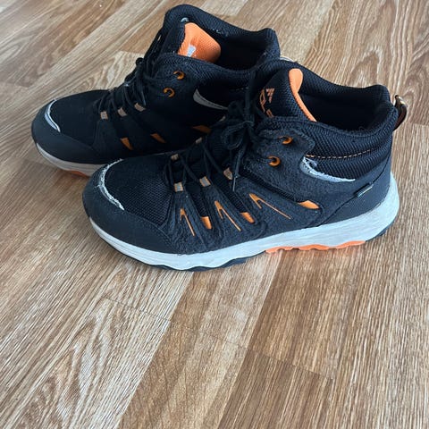 Pent brukte tursko for barn i størrelse 28. Skoene er ankelhøye og har svart overdel med oransje detaljer. Overdelen er i tekstil og syntetisk materiale, med snøring og hurtiglås foran. Sålen er i gummi med mønster for bedre grep. Egnet som tursko og fritidssko for barn.