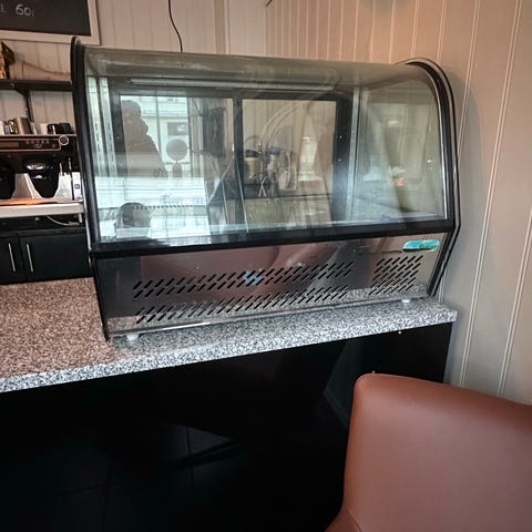Rustfri kjøledisk med integrert glassmonter. Underdelen består av kjølt skap med dører i rustfritt stål og perforerte hyller/brett for oppbevaring av matvarer. Overdelen er en lukket glassmonter med flere glasshyller for presentasjon av mat, for eksempel kaker, smørbrød eller andre serveringsklare produkter. Enheten har elektronisk temperaturvisning og betjeningsknapper i front. Egner seg til bruk i kantine, kafé, restaurant eller lignende serveringssteder der det er behov for kjølt oppbevaring og visning av matvarer i samme enhet.