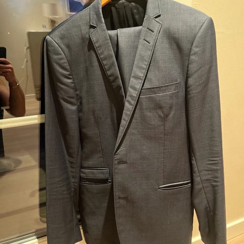 Tiger of Sweden dress for herre i størrelse 50 (jakkke) 52 (bukse). Dressen er i grå ull/polyester med et diskret rutete mønster i stoffet. Innsiden har glatt fôr, og plagget leveres med Tiger of Sweden-plaggpose slik det fremgår av bildene. Passer som del av dress eller alene som blazer til formelle og semi-formelle anledninger.
