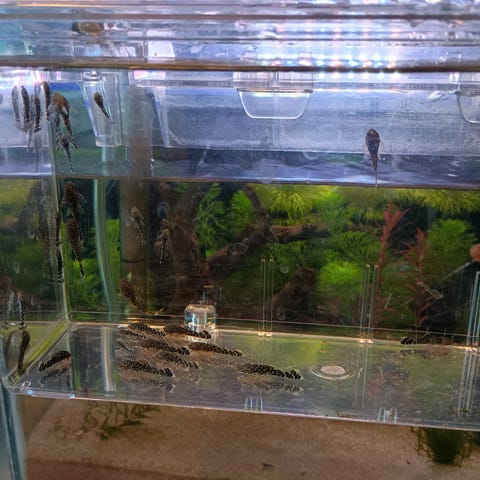 Selger forskjellig varianter i størrelse og farge av Ancistrus antennemalle yngel.