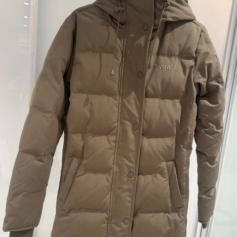 Svea dunjakke for dame i størrelse XS. Jakken er svart med hette og avtagbar eller fast pelskant (basert på bilder). Ytterjakken er fylt med dun og har glidelås og knappelukking i front, glidelåsen kan være litt sta innimellom. Modellen har lommer foran og et merke med flaggdetalj på ermet. Passer som yttertøy i kaldere vær.