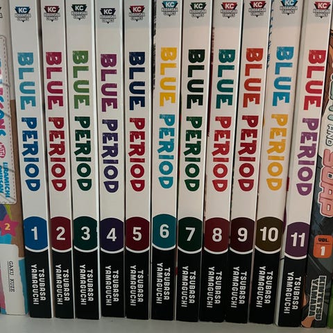 Blue Period manga samling av volume 1–7. Serien er en japansk tegneserie (manga) med paperback-innbinding. Bøkene følger samme serie og utgave, med nummererte omslag fra 1 til 7. Passer for lesere som ønsker hele den første delen av Blue Period samlet i en pakke, eller bare individuelle bøker!