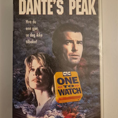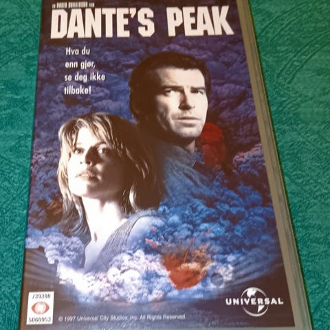 Universal Dante’s Peak VHS-film. Norsk utgave av spillefilmen utgitt på videokassett (VHS). Kassetten leveres i original plastboks med trykt omslag. På omslaget finnes filmomtale, bilder fra filmen, aldersmerking og teknisk informasjon som digital stereo-lyd. Egnet for avspilling på standard VHS-spiller som støtter PAL-format.