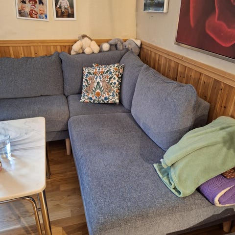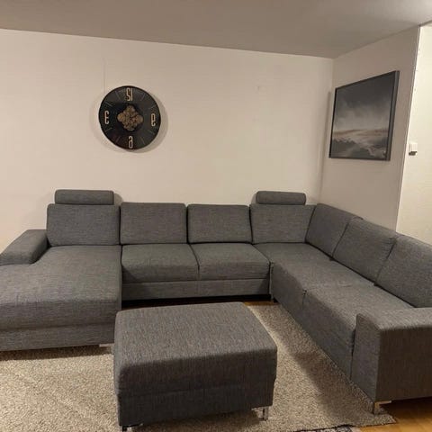 Grå Modern Living U sofa med sjeselong.Den har ingen hull eller skader men er synlig brukt.2 nakkestøtter.Sjeselongen er 163 cm