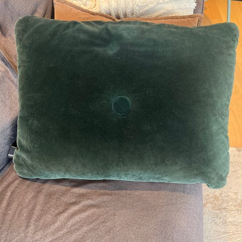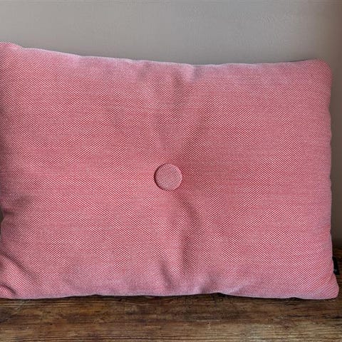 Hay pute i rektangulær form i gul farge. Puten har knappdetalj i midten på den ene siden og struktur i tekstilet. Egner seg som pyntepute i sofa, stol eller på seng.