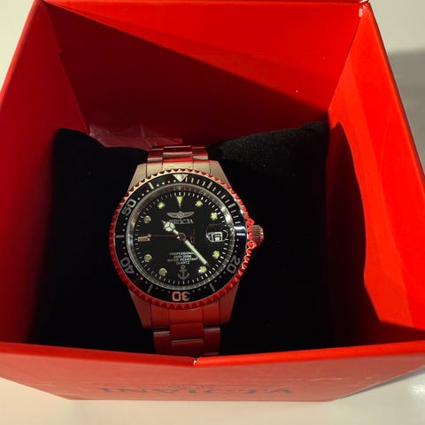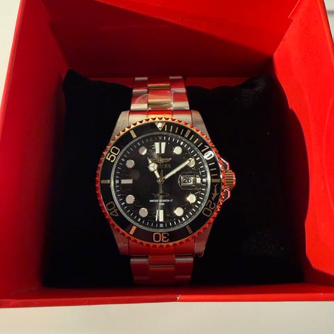 Klokken er nesten ikke brukt og oppbevart i eske. Kjøpsbevis og eske medfølger.