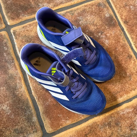 Adidas joggesko for barn i størrelse 35. Modellen er unisex og har overdel i pustende tekstil i hvit farge med svarte og oransje detaljer. Skoene har snøring for justerbar passform og yttersåle i gummi med godt mønster for grep. Innleggssålen er merket med «End Plastic Waste». Egnet som hverdagssko eller til lett trening for barn.
