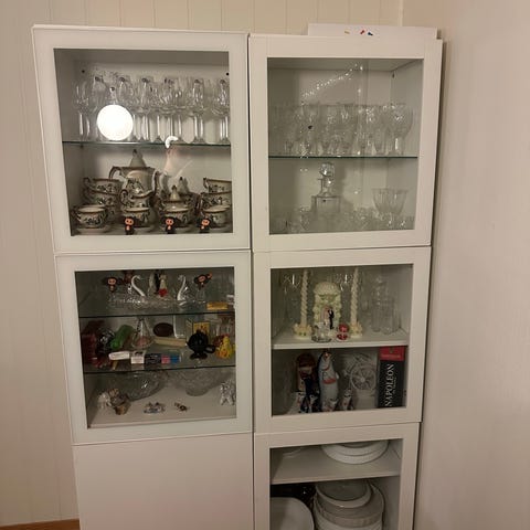 Bestå oppbevaringskombinasjon / høyskap / vitrineskap med lys og tilhørende fjernkontroll med dimmer. 193 cm høy, 120 cm bred og 42 cm dyp. Selges mot henting. Innholdet i skapet følger ikke med.
