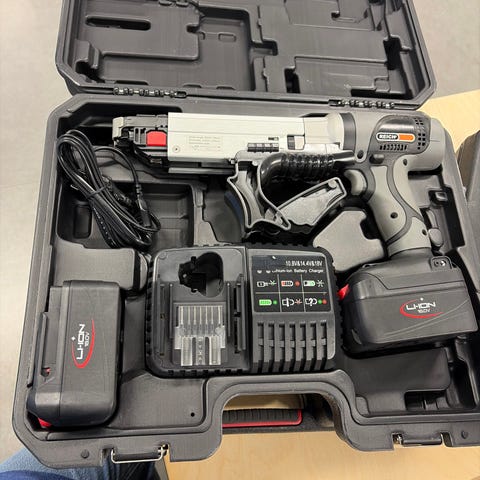 Settet inneholder skrudrill med integrert skrue magasin, batteri, lader og koffert. Verktøyet er egnet for serievis innskruing av skruer, for eksempel til montering av gipsplater eller andre innrednings- og byggearbeider der det brukes båndede skruer.
