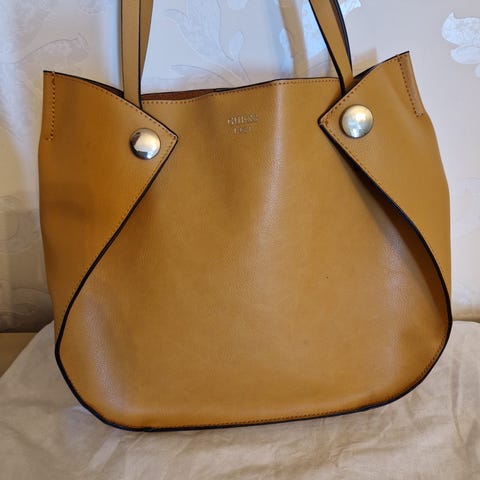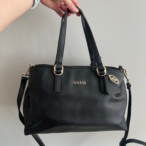 Praktisk veske fra GUESS i imitert skinn. To siderom og et hovedrom med fire mindre rom for mobil og diverse. Crossover rem og bærehåndtak.
