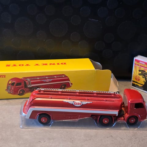 Dinky Toys Esso tankbil lekebil i rød farge. Modellen er laget i metall med påtrykte Esso-logoer på sidene og bak. Bilen har ikke vært lekt med, oppbevart i originalpakning.