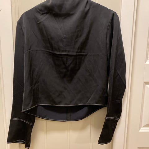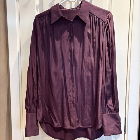 Sateng/silke-aktig bluse fra H&M, V-ringet, str.S. Brunt 1-2ganger, så god som ny. Selges da eg har flere.
