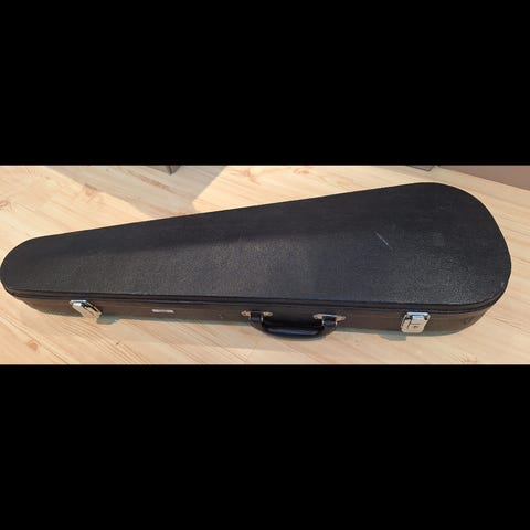 Fiolin i 1/2 størrelse med etui i hardtype og bue. Fiolinen har brun lakkert trefinish med sort hakebrett. I god stand, pent brukt, har vært ubrukt i flere år. Etuiet har blå fløyel innvendig, rom for harpiks, bærehåndtak og skulderreimer for enkel transport. Barnefiolin, elevfiolin.