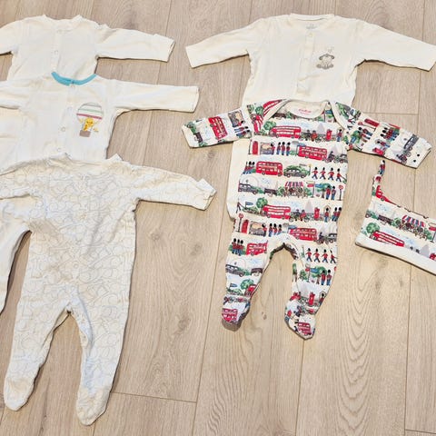 Selger klespakke til barn i størrelse 68 (3-6 måneder). Pakken inneholder 6 pysjamasoveraller i 100% bomull.