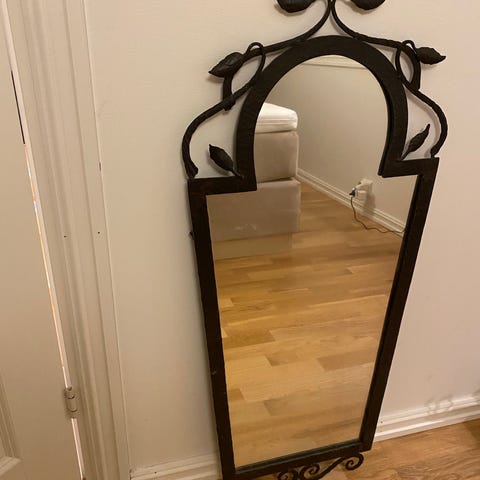 Varmeskjold for peis/ovn i messing. Buet topp og dekorert kant. Skjermen står på to ben som gir stabilitet. Hammerslag struktur. Egnet som skjerm, varmeskjold ved vedovn eller kamin. Kan sendes etter avtale.