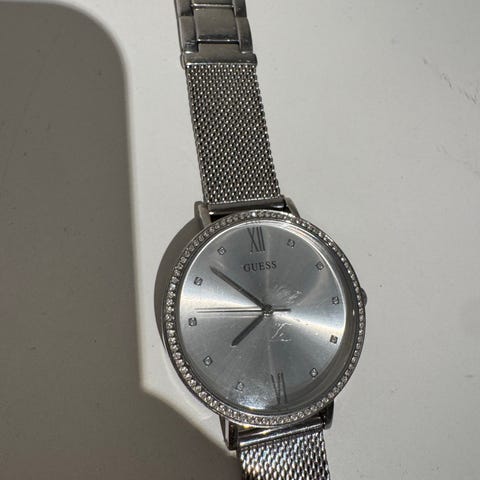 Klokken selges da den ikke brukes lengre. Den er 15cm, stainless steel, sølvfarget. Den har noen bruksmerker ved låsen(se bilde), men eller i god stand. Må byttes batteri.