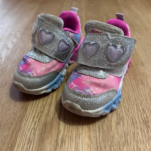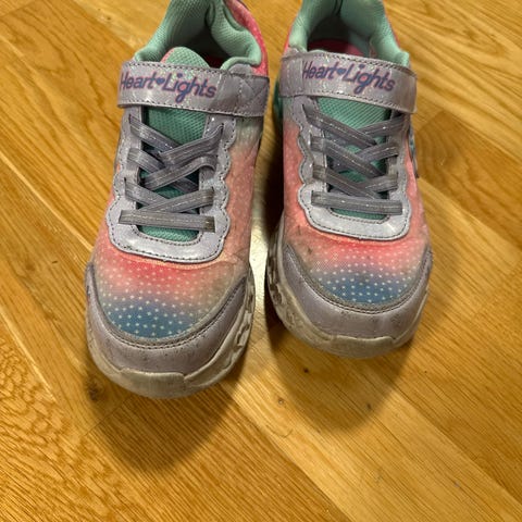 Blinkesko som har sluttet å blinke fra Skechers i str.23. Godt brukt, mye bruk igjen. Overdelen er i fargerikt mønstertrykk med glitter. I sålen er det utskårne hjerter. Skoen er lett å ta på med en elastisk strikk og lukkes med borrelås foran, og trenger derfor ikke å knytes.