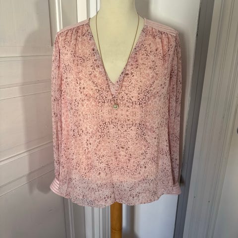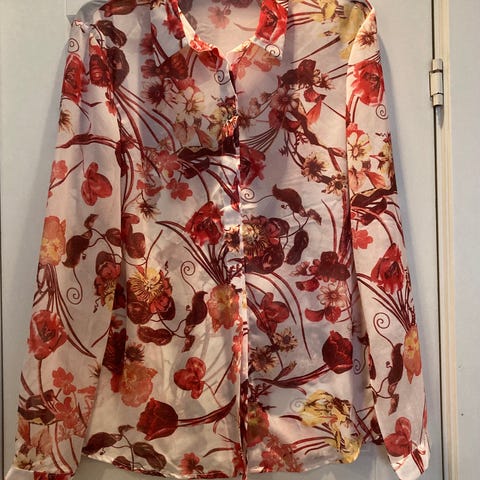 Hale Bob bluse for dame i størrelse XL. Blusen er flerfarget med blomster- og sommerfuglmotiv i hovedsakelige rosatoner på lys bunn. Materialet er viskose, som gir et lett og mykt stoff. Modellen har krage, knappestolpe foran og lange ermer med rynkedetaljer. Passer til bruk med både bukser og skjørt i hverdagen eller til mer pyntede anledninger.
