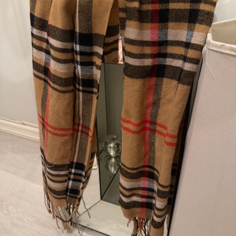 Burberry skjerf i klassisk rutete mønster i beige toner med innslag av svart, hvitt og rødt. Skjerfet er unisex og har frynser i endene. Egner seg som tilbehør til både hverdagsbruk og mer formelle antrekk.