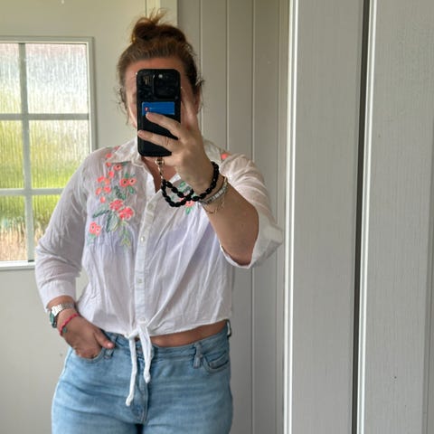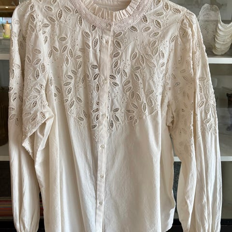 Selger en fin hvit skjorte/bluse med beige broderte detaljer.