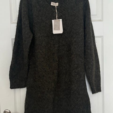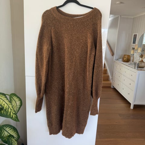 OBJECT hverdagskjole i brun farge for dame i størrelse M. Kjolen er laget i ullmateriale og har lange ermer. Den har v-utringning og rett passform som rekker omtrent til over kneet, avhengig av høyde. Egnet som hverdagskjole i kjøligere vær. Lappen er klipt bort