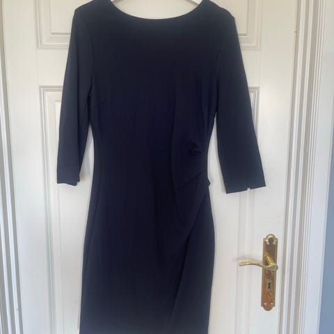 KAFFE sommerkjole i størrelse M for dame 👗 Kjolen er mørk blå, har korte ermer, rund hals og lett strukturert ribbestrikket materiale. Lengden går omtrent til kneet, og passformen er kroppsnær med enkel drapering i siden. Egnet til fest, hverdag, enkle anledninger i varmere sesong, eller innendørs hele året.