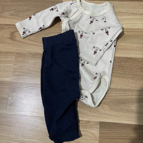 Hust & Claire babysett bestående av langermet omslagsbody og bukse i ribbesteikket kvalitet. Beige farge med jordbærmotiv. . Størrelse 62. motiver. Bodyen har knepping i siden og mellom beina for enklere av- og påkledning. Buksen har elastisk linning i livet. Ribbestruktur i stoffet gir lett stretch og god bevegelsesfrihet. Passer som hverdagsplagg eller som innerlag for baby i størrelse 62.