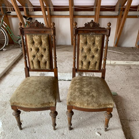 Stolene har utskårne detaljer i treverket og dekorative nagler rundt rygg og sete. Egner seg til pynt. Klassisk stil med høy rygg og solid konstruksjon i heltre.