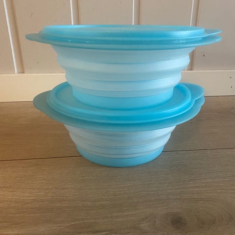 Vidunderskålene er lufttette og bevarer maten veldig godt. Den største rommer 3 liter, den minste 2 liter.
