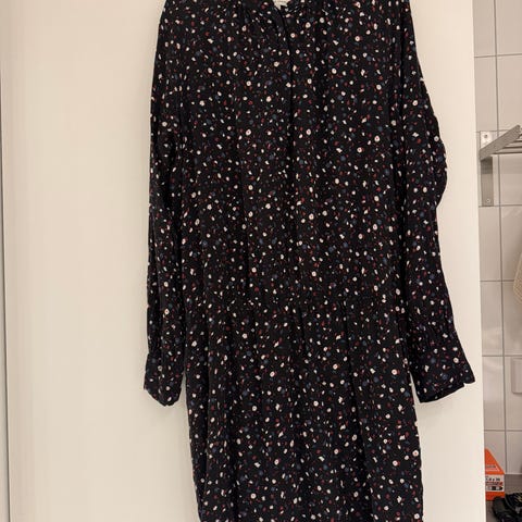 Second Female hverdagskjole i størrelse M. Kjolen er beige med prikkete bunn og blomsterprint i kontrastfarger. Den er laget i viskose og har lange ermer. Modellen har knappelukking foran og en løs, rett fasong som passer til hverdagsbruk. Dette er en damekjole som kan brukes alene eller kombineres med strømpebukse eller bukse etter behov.