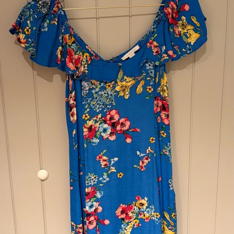 Faithfull the Brand sommerkjole i str XL (mer som L). Selges da den dessverre er litt for liten. Kort modell. Materiale: 100 % rayon/viskose. Har fjernet båndet/sløyfen på midten (som man ser på bildet). Puffermene sklir litt på skuldrene, så passer best å bruke offsholders. Glidelås i siden.