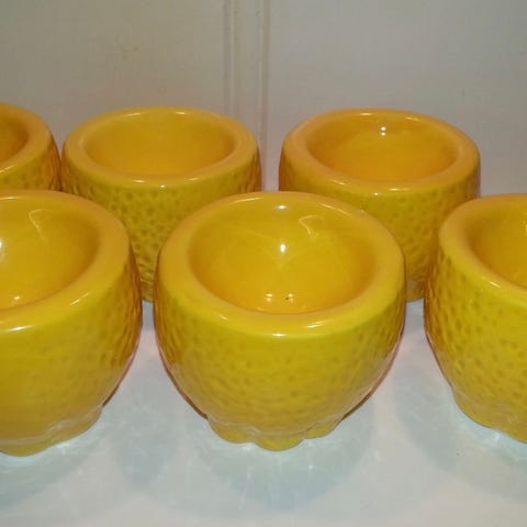 Vintage IKEA Lemon eggeglass i gul keramikk. Sett med små eggeglass med strukturert overflate og avrundet form. Egnet til servering av kokte egg ved frokost- og brunsjbord.