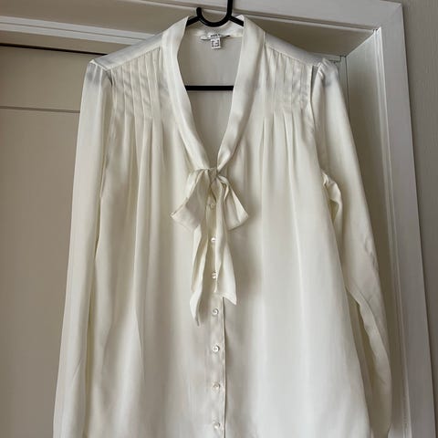Blusen er lettstelt, trenger ikke å strykes etter vask. Har et fint bånd foran. Dette kan henge som et slips, knyttes som sløyfe eller tas av. Blusen har V utringning og skjult knepping. Veldig fin på!