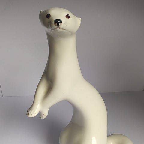 Porselen figuriner formet som røyskatt, i hvit glasert porselen. Figuren står oppreist på bakbeina. Undersiden er merket «Made in USSR». Egner seg som dekorasjon i hylle, på skjenk eller bord. Selges som sett med to like figurer.