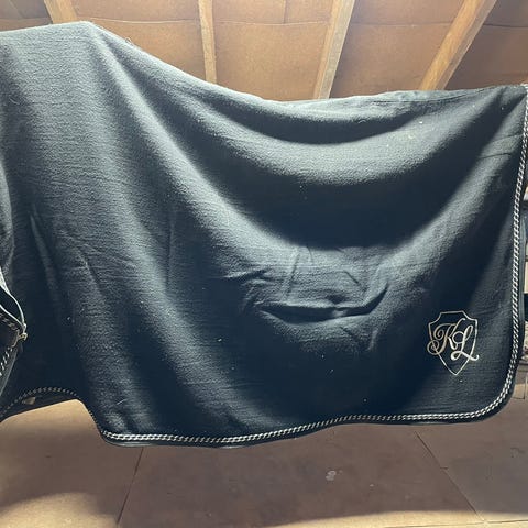 Kingsland ullpledd i svart. Pleddet er laget av 70 % ull og 30 % polyakryl. Det har Kingsland-logo med krone og bokstavene KL. Helt supert teppe, som er deilig og varmt. Koster 3999 nytt.