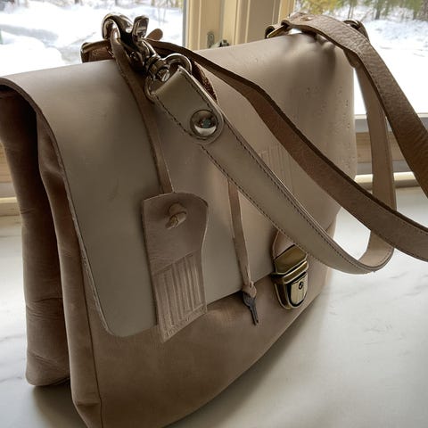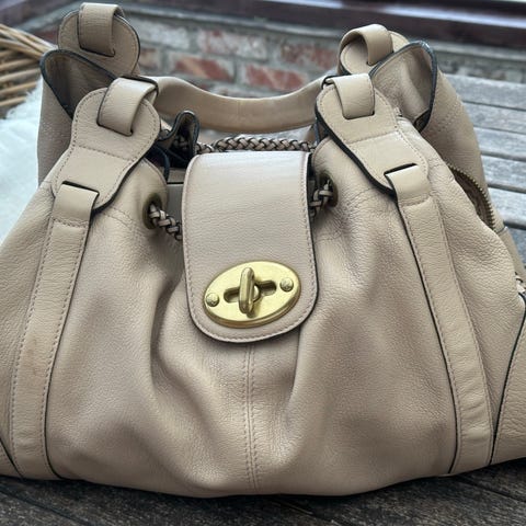 Vesken har målene: lengde 33 cm, bredde 12 cm, høyde 14 cm. Pent brukt, kun et par små riper og flekk rundt hankfester