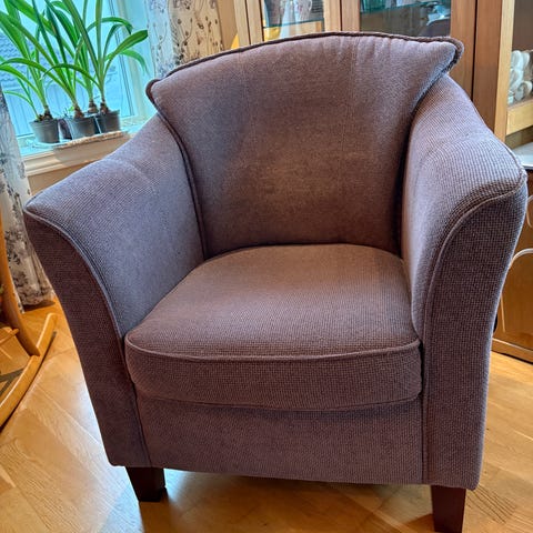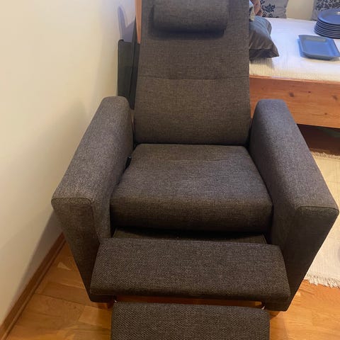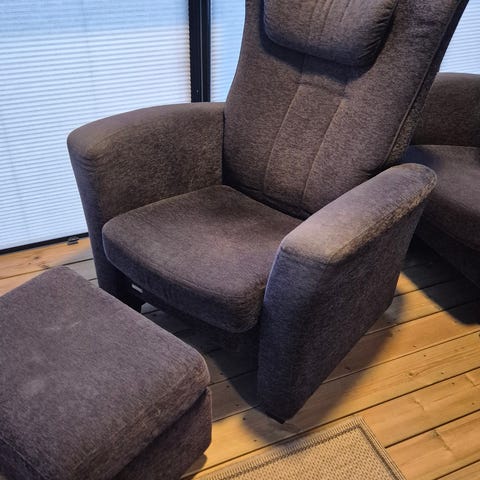 Godt brukte lenestoler med innebygget fothvilere. Brun/grå farge, Hele i stoffet. ikke røyk.