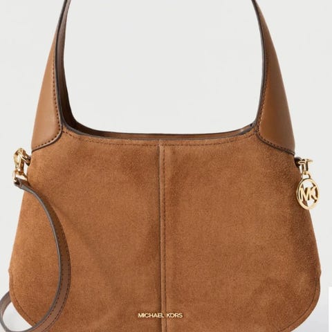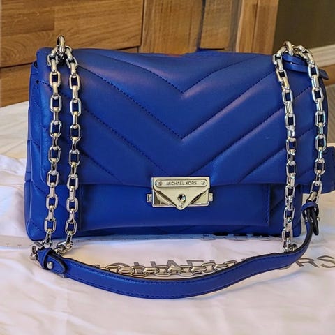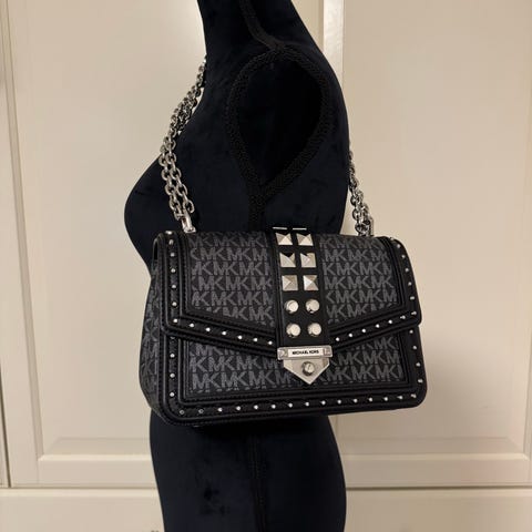 Helt nydelig sjelden Michael Kors whitney teal veske for dame i semsket skinn. Vesken har klaff med metallås og dekorative nagler på forsiden og langs kantene. Den leveres med en kombinasjon av skulderrem i semsket skinn og metallkjede. Innvendig har vesken et hovedrom og mindre lommer som egner seg til oppbevaring av mindre eiendeler. Det følger med en oppbevaringspose med Michael Kors-logo. Nærmest ubrukt så fremstår som ny. Dustbag følger med!