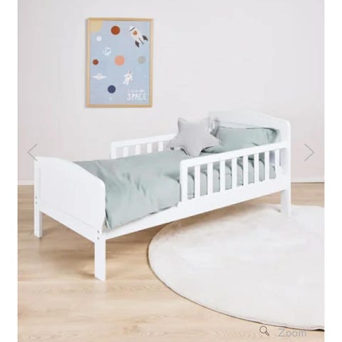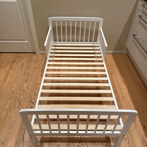 JLY juniorseng i hvit farge. Sengen har sengehest på den ene langsiden og en åpen kortside for enkel inn- og utstigning. Klassisk design med sprosser på sidene. Passer som overgangsseng fra sprinkelseng til vanlig seng for barn.