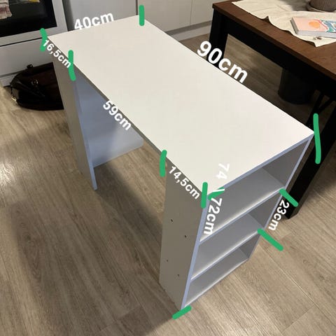 Skrivebord og hylle kommer med en del bruksmerker, samt noen hakk. Se nærbilder for inntrykk av stand.