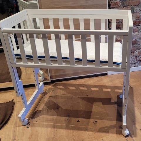 Troll bedside crib barneseng i hvit farge. Sengen har sprinkler på sidene og åpen langside mot foreldreseng når den brukes som bedside crib. Passer til spedbarn/baby. Madrass kan følge med om ønskelig. Vi har pusset ned og malt den på nytt. Fremstår i god stand kanskje noen mindre bruksmerker.